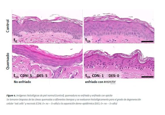 Los resultados que comparan las muestras de quemaduras enfriadas con EPICITE RESCUE® y no enfriadas mostraron diferencias histológicas importantes, especialmente en la primera hora después de las quemaduras. La quemadura enfriada con EPICITE RESCUE® mostró: